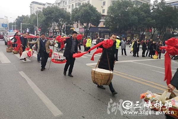 1月2日上午9時許,鼓鑼齊鳴,龍飛獅舞。人們抬著披紅掛彩的豬、羊,挑著裝滿臍橙、臘貨、陳釀老酒等農副產品的“豐收擔子”列隊前行。