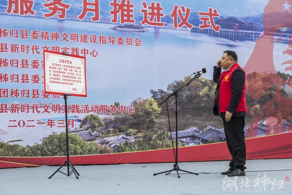 近年來,秭歸縣志愿服務活動蓬勃發展,涌現出一大批志愿服務先進集體和模范人物。推進儀式上,黨的十九大代表、第六批全國崗位學雷鋒標兵、中國好人王華君,全國脫貧攻堅先進個人、中國好人龔萬祥,全國“人民滿意公務員”、中國好人譚斌等志愿服務先進典型作為嘉賓出席活動。王華君帶領在場的全體志愿者莊嚴宣誓。