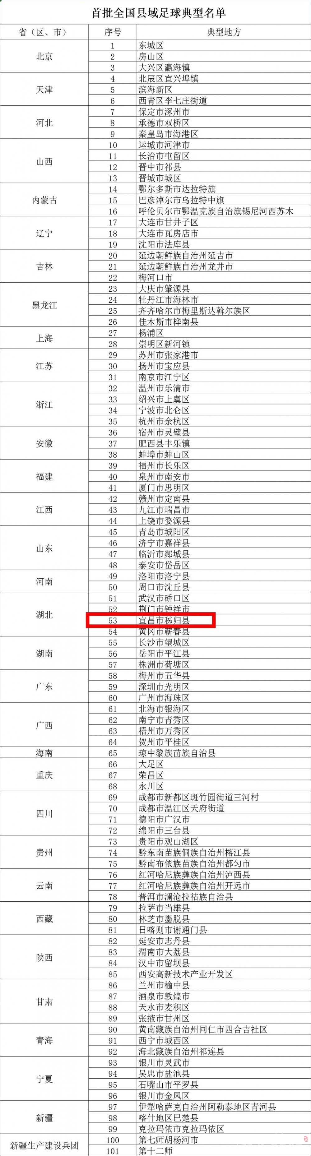 日前,國家體育總局下發(fā)《體育總局辦公廳關(guān)于公布首批全國縣域足球典型的通知》,公布了全國101個(gè)“首批全國縣域足球典型”。湖北省有四個(gè)縣域入選,其中宜昌市有且僅有秭歸縣當(dāng)選,成為首批全國縣域足球典型!