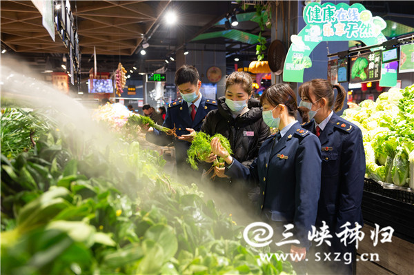 市場(chǎng)監(jiān)督管理工作人員正在抽查蔬菜類產(chǎn)品