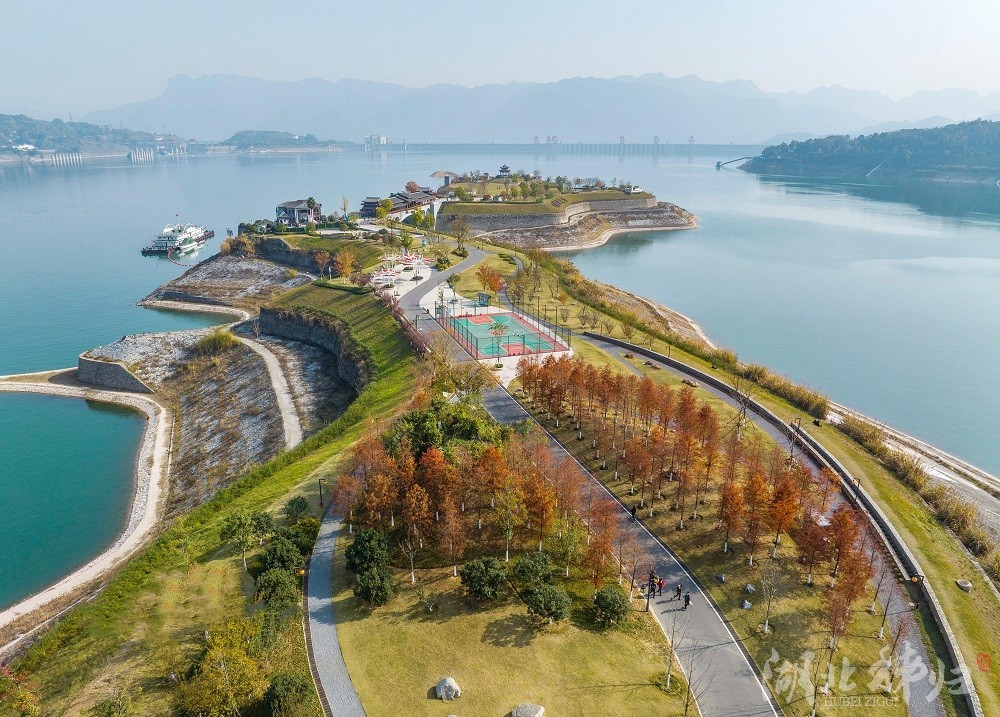眼下,長江三峽兩岸層林盡染、色彩斑斕,與藍天、碧水構成一幅美麗的冬日生態(tài)畫卷。近年來,緊鄰三峽大壩的湖北省宜昌市秭歸縣全面修復三峽庫區(qū)生態(tài),采取庫岸工程治理、岸線植綠復綠等措施,將昔日庫岸線上的荒灘野嶺建設成人們健身游樂的綠道、公園和景區(qū),在三峽大壩前構筑起一道美麗的生態(tài)屏障。圖為2022年12月14日,湖北省宜昌市秭歸縣木魚島公園風光。(王罡攝)