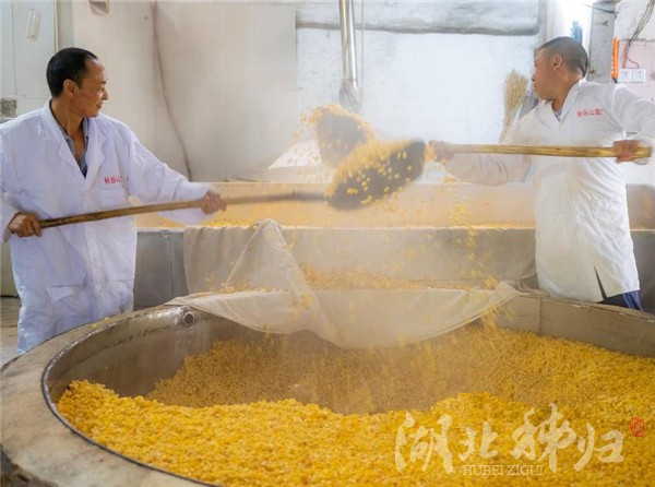 8月4日,秭歸縣磨坪鄉秋谷山古法釀酒非遺工坊工人在攤晾蒸熟出甑的玉米。