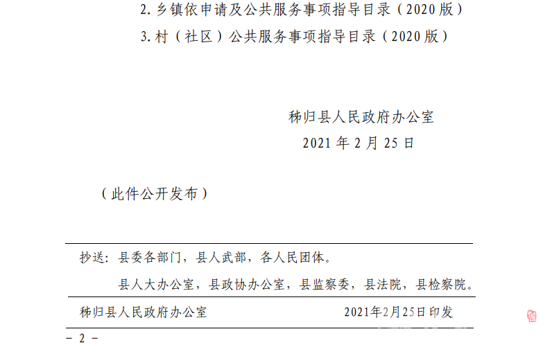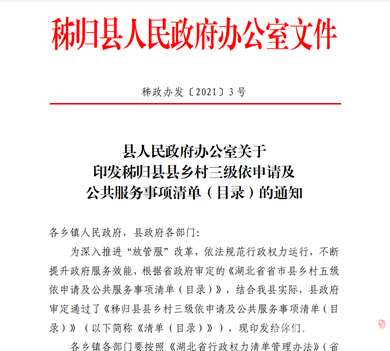 縣人民政府辦公室關(guān)于印發(fā)秭歸縣縣鄉(xiāng)村三級(jí)依申請(qǐng)及公共服務(wù)事項(xiàng)清單(目錄)的通知