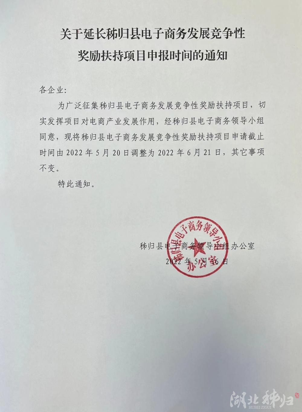 關于延長秭歸縣電子商務發展競爭性獎勵扶持項目申報時間的通知